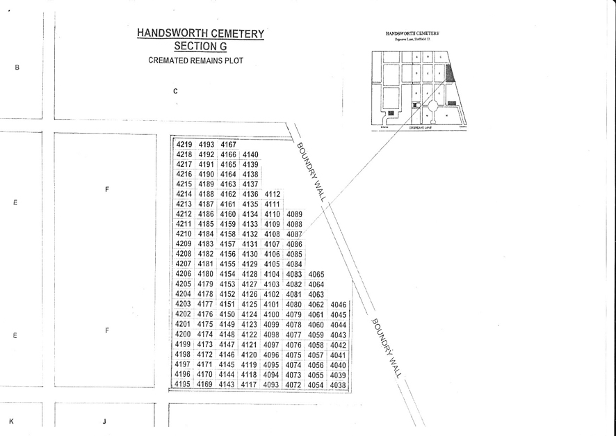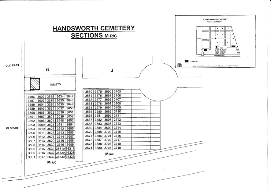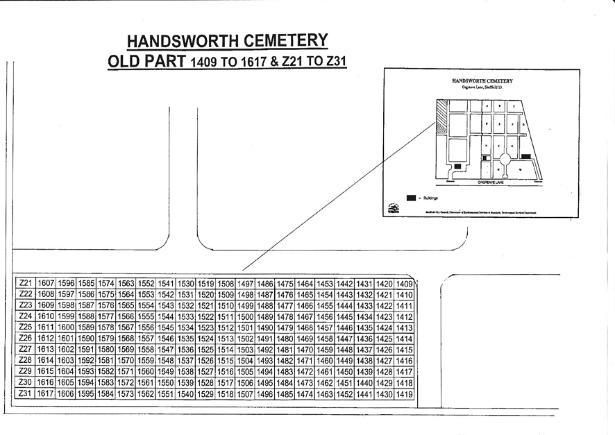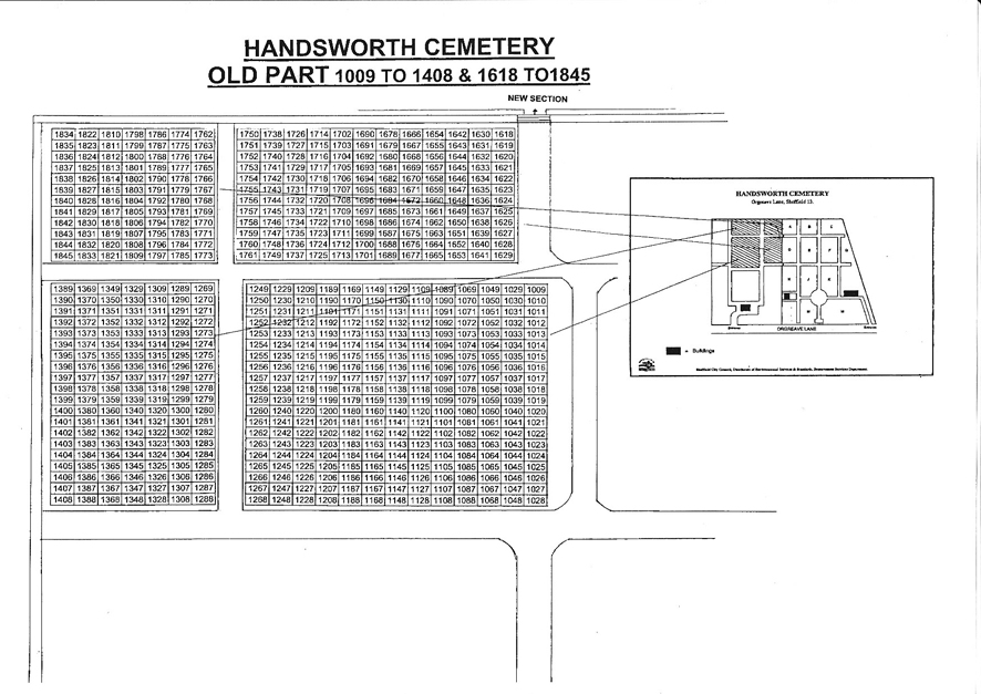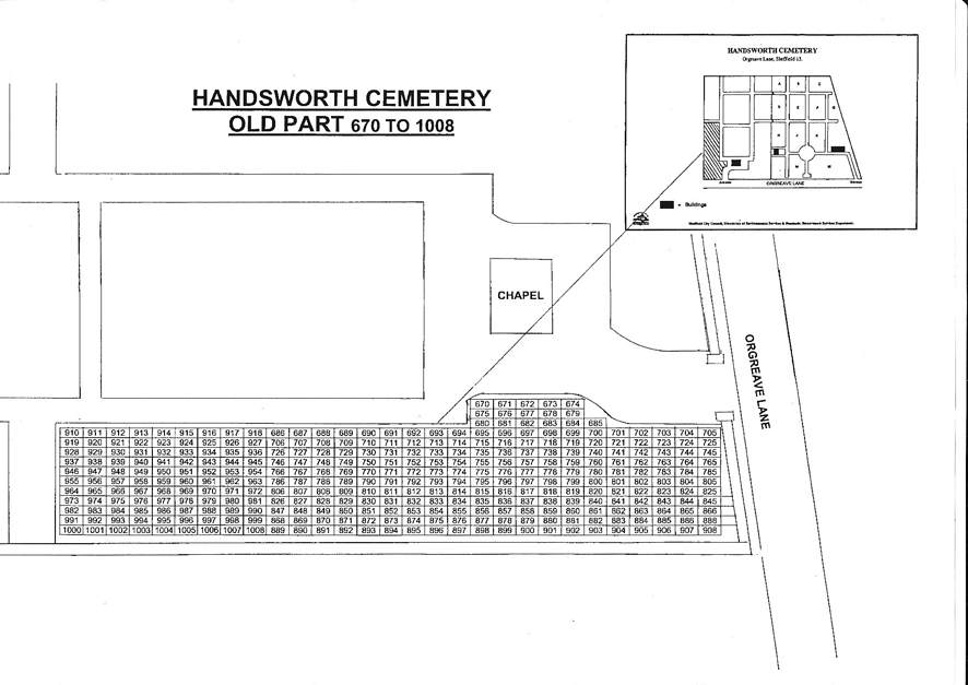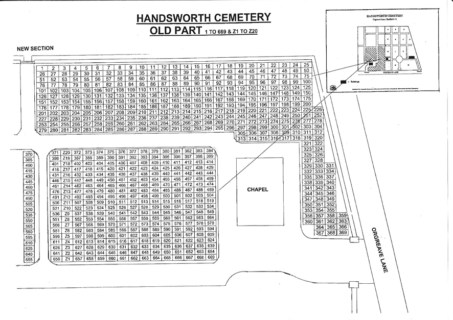 Handsworth The burials are located in two separate areas (see map), the first is in the Old Burial Ground next to the church on Handsworth Road. The second is the 'new' area located on Orgreave Lane, which is divided into two logical areas. The new section which has section numbers A, B, C, etc and the old section which does not have section numbers.